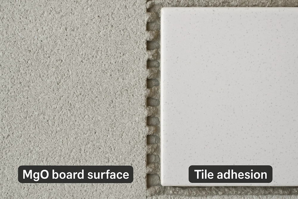 Obe dosky poskytujú vynikajúce povrchy na priľnavosť dlaždíc. Kľúčový rozdiel spočíva v metóde. Porézna povaha cementovej dosky umožňuje, aby sa tenká malta mechanicky spojila, keď sa lieči na povrch. Niektorí výrobcovia odporúčajú napätie povrchu, aby sa znížila absorpcia a zabránila príliš rýchlemu vyschnutiu, čo môže oslabiť väzbu. Hladký, hustý povrch dosky MGO poskytuje silnú chemickú väzbu s tenkým súpravou, ktorá zaisťuje, že dlaždice bezpečne a trvajú roky.